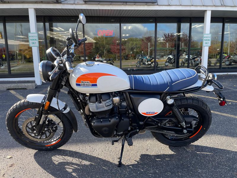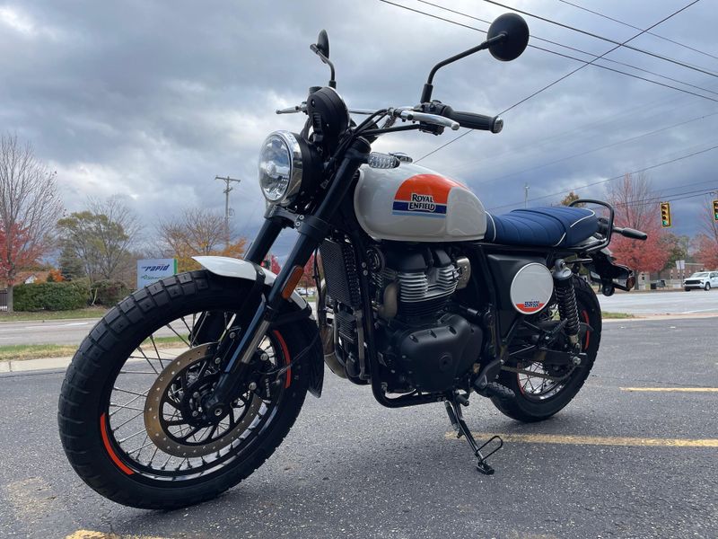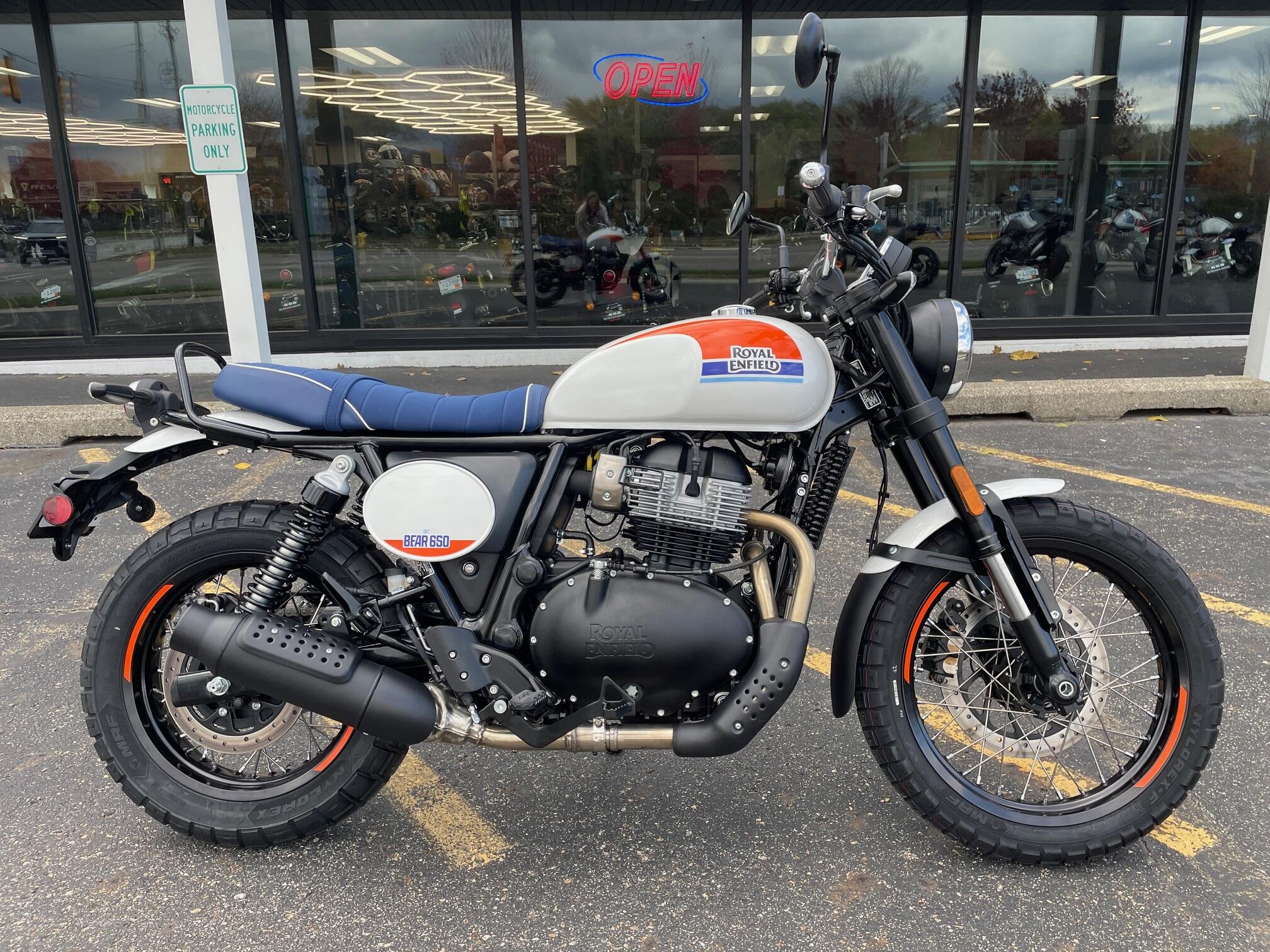 The Bear 650 from Royal Enfield is a 648 cc parallel-twin scrambler that brings a vintage 60s desert-race aesthetic with modern tech—featuring a 19″ front/17″ rear spoked wheel combo on dual-purpose tires, full LED lighting, a 2-into-1 exhaust with higher torque, and a smart TFT dash with turn-by-turn navigation.
