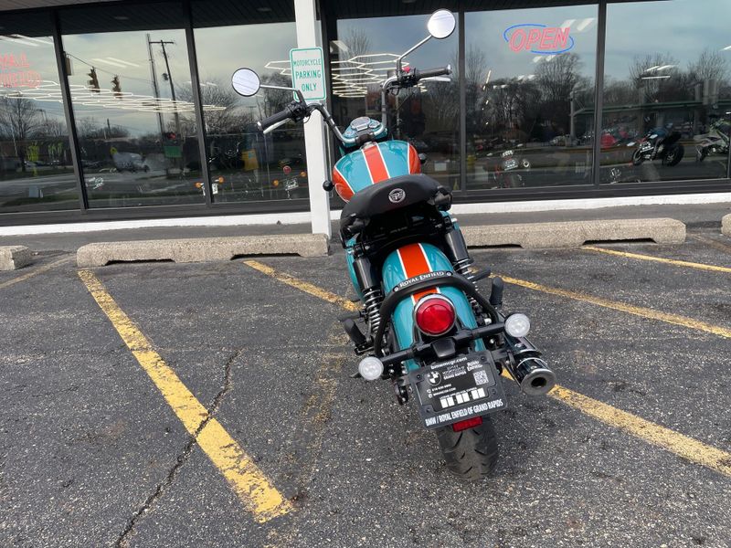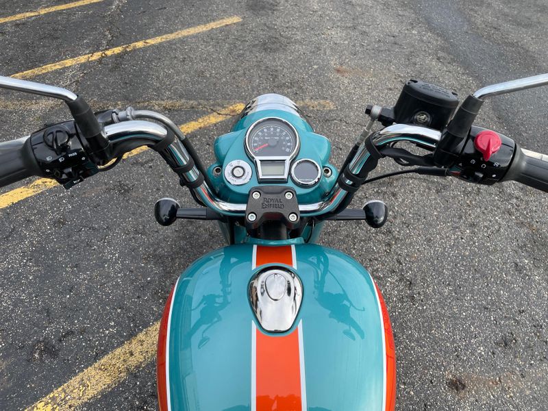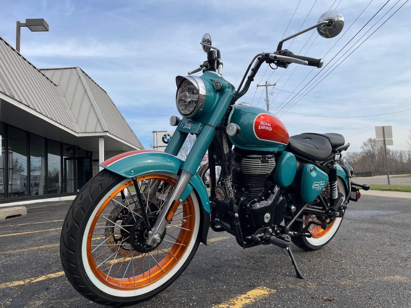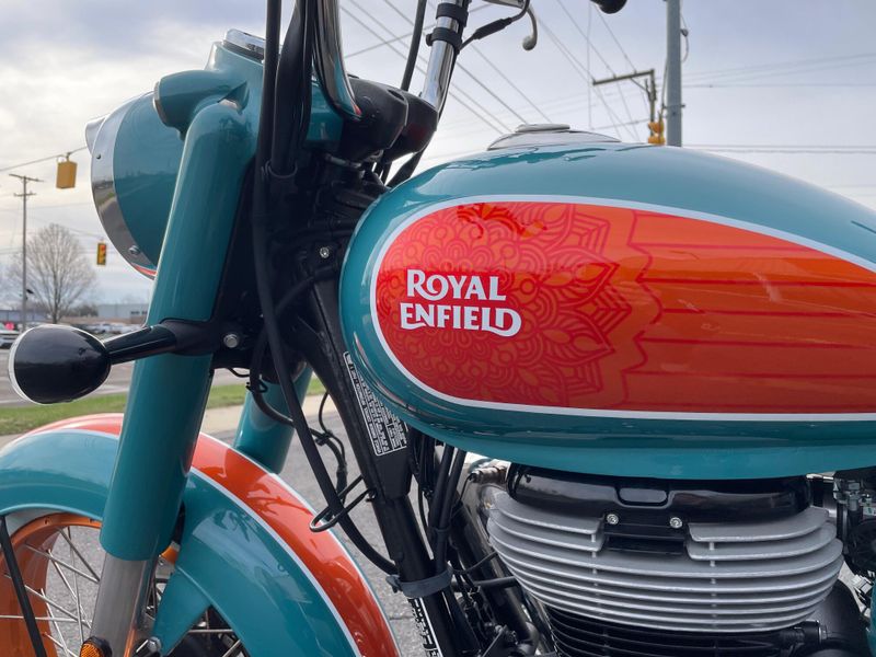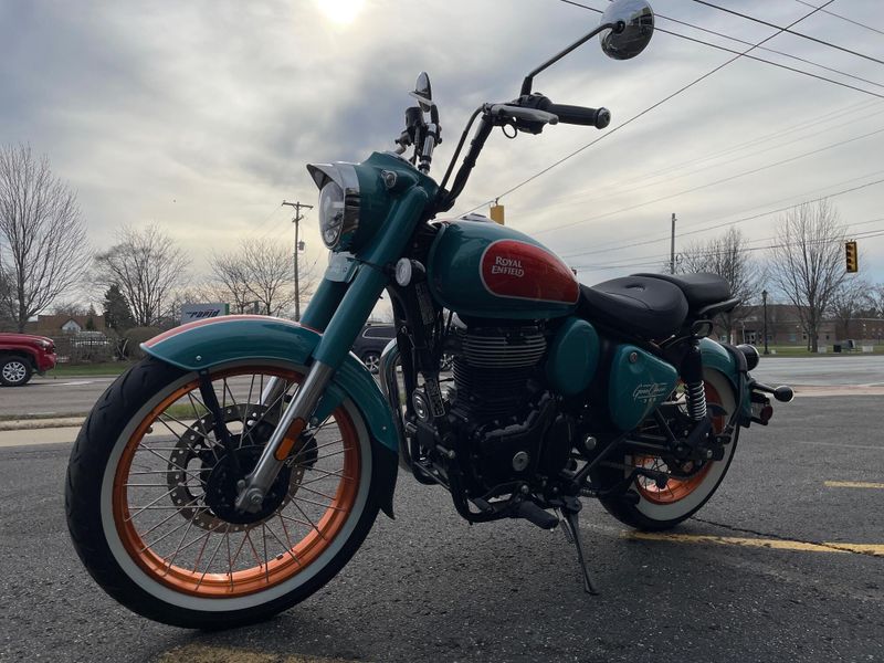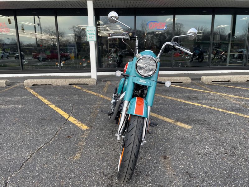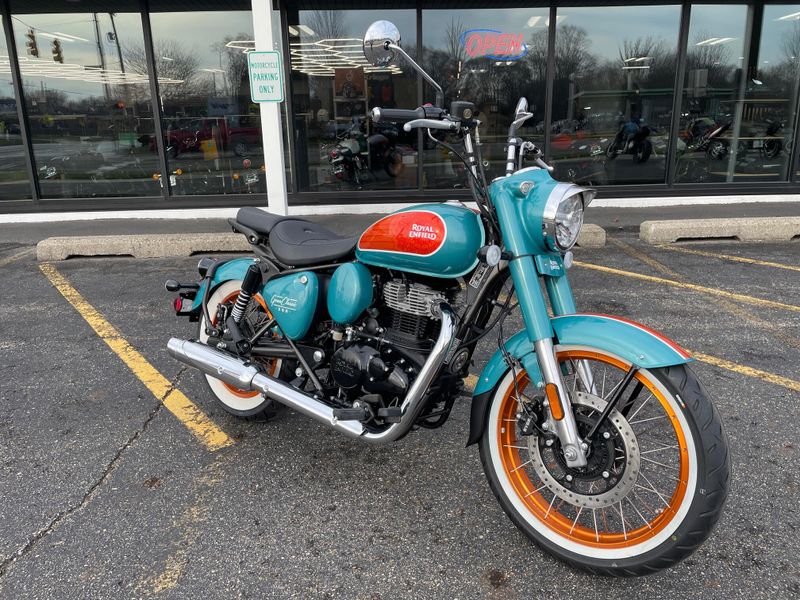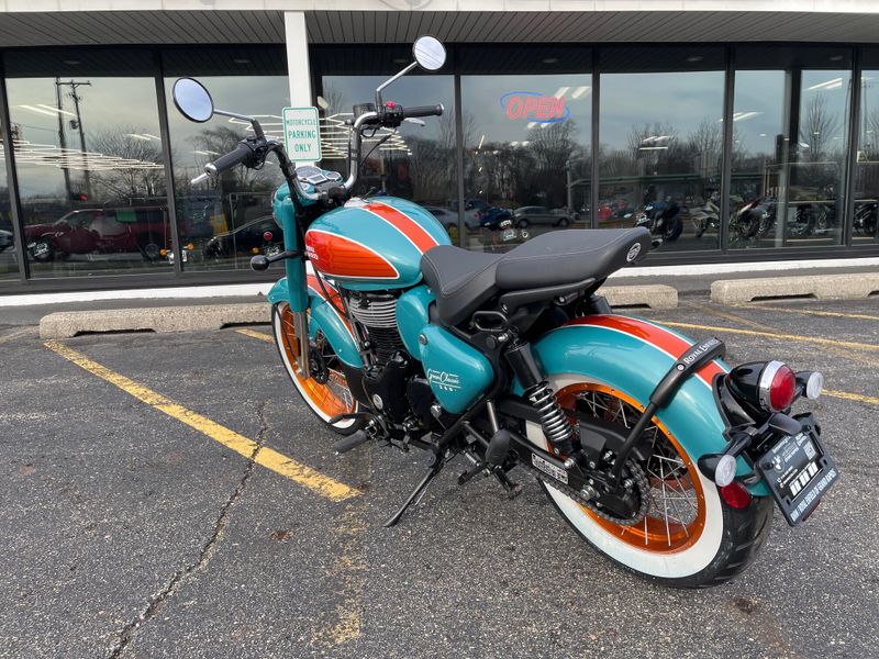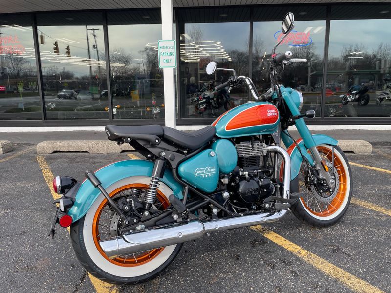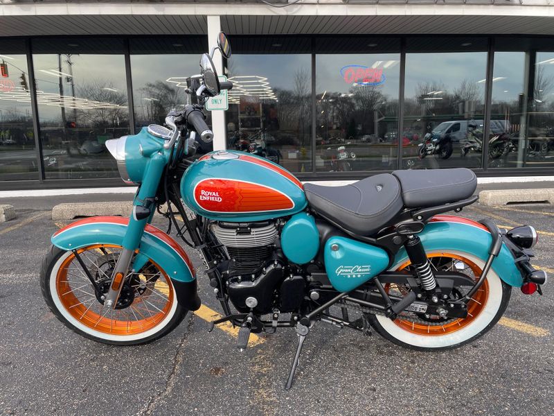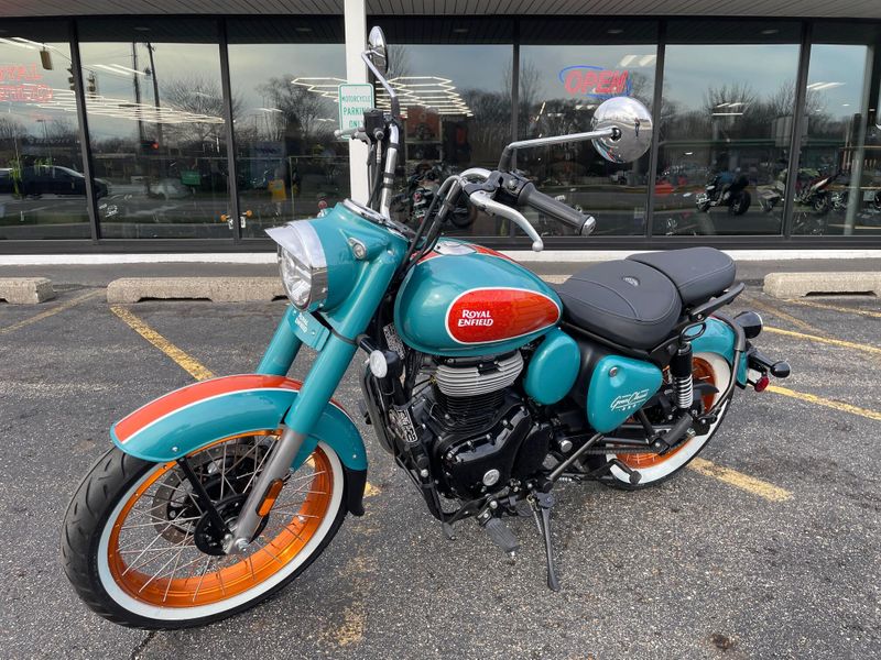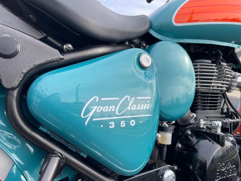 The 2026 Royal Enfield Goan Classic 350 is a retro bobber-style motorcycle with a 349cc engine producing about 20 hp and 27 Nm torque. It features ape-hanger handlebars, a low single seat, whitewall tires, and modern touches like LED lighting for relaxed cruising.